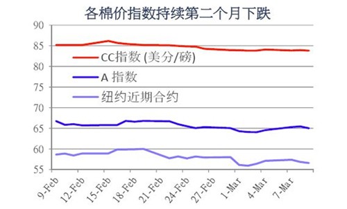 全球棉价持续第二个月下跌。上个月,纽约期货合约价格在合同有效期内出现连续下跌,从一个月前的接近59美分/磅降至56美分/磅,达到2009年以来的最低。A指数也下跌了约3美分/磅,已跌至64-65美分/磅。
