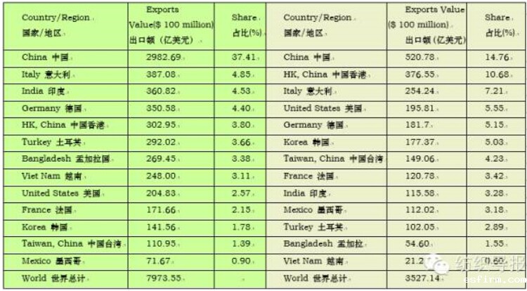 中国的领先地位短期难以动摇,世界纺织品服装出口前十名中有一半是欧美发达国家,意大利出口份额超过印度等传统出口国家和地区。