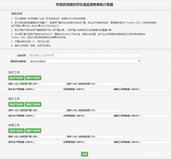 “纯棉纱折标准品用电单耗” 网页版计算器界面