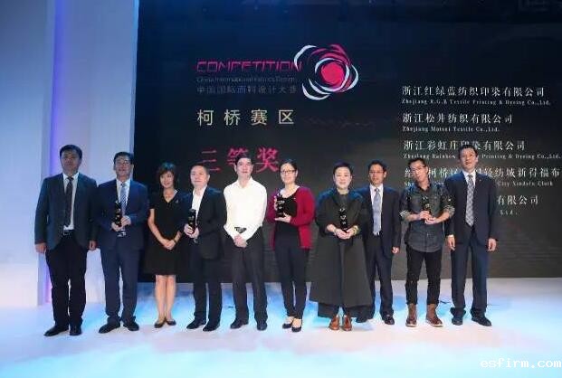 “中国国际面料设计大赛(柯桥赛区)”颁奖典礼在开幕式上举行,时尚周主办方对八家获奖企业进行了隆重授奖:绍兴皕帛仁纺织品有限公司、绍兴市柯桥区中国轻纺城新得福布行、浙江彩虹庄印染有限公司、浙江松井纺织有限公司、浙江红绿蓝纺织印染有限公司、绍兴天羽提花织造有限公司、浙江宇粤纺织品有限公司、浙江草木纺织科技有限公司。