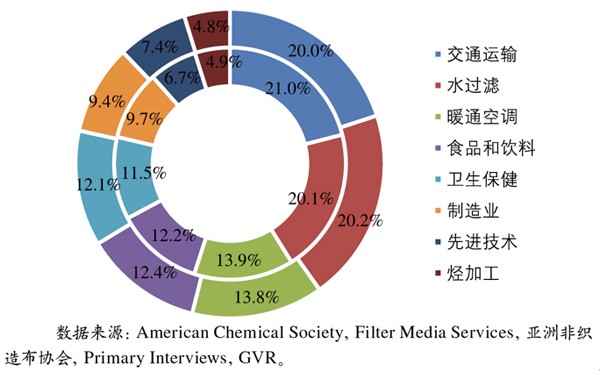非织造材料在过滤与分离领域有着非常广泛的用途,如石油、化工、能源、环境、食品饮料、生物制药、医疗、海洋、军事等领域。近年来,消费者对健康和安全用水需求的快速增长以及环境保护意识的日益提高,很好地驱动了全球非织造过滤介质市场的增长。而工业、交通运输以及快速发展的基础设施建设带动的暖通空调领域对非织造过滤介质的需求也在快速增长。