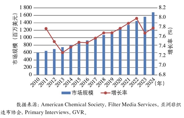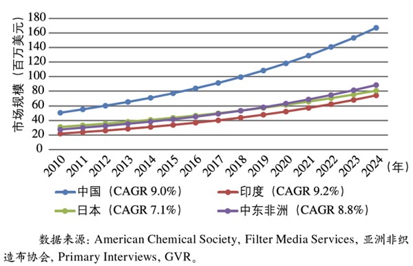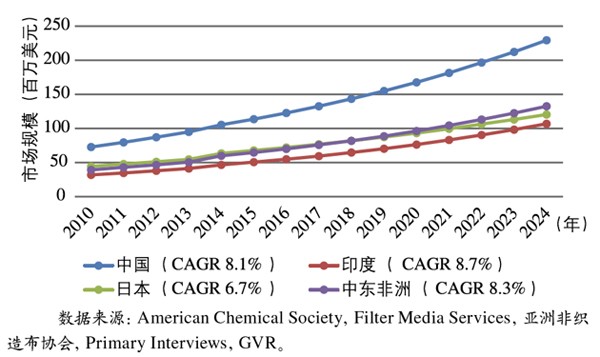 工业的高速发展已经成为带动非织造滤材市场不断扩大的另一大重要驱动力,尤其是钢铁、冶金、水泥、化工行业以及电力和垃圾焚烧炉等领域,其烟气中粉尘治理大量采用袋式除尘技术,带动非织造高温过滤材料大幅增长。据GVR的调查和预测,2015年全球工业用非织造过滤介质的市场规模为4.16亿美元,未来10年有望以7.3%的年均复合增长率增长,到2024年市场规模将达到7.81亿美元。其中,亚太地区新兴制造业大国印度以快速增长的制造业确立了非织造过滤材料在该领域应用的快速增长,预计年均增长率将达到8.9%,市场规模将由2015年的2350万美元增至2024年的5030万美元。
