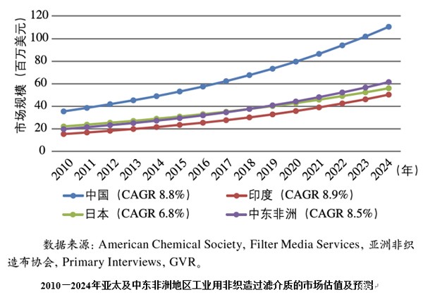 2010—2024年亚太及中东和非洲地区非织造过滤介质在交通运输领域的市场估值及预测