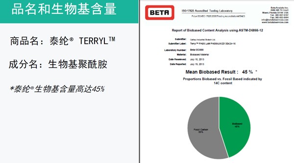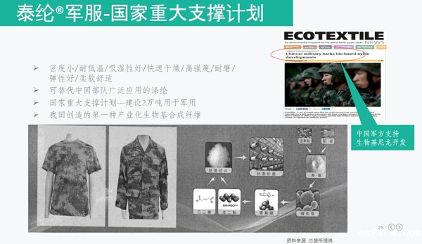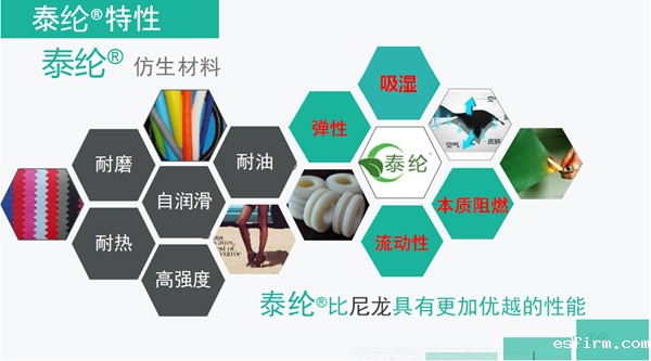 泰纶®是上海凯赛生物技术研发中心有限公司通过生物法合成技术生产开发的一种新型生物基聚酰胺纤维,泰纶?纤维生物基含量高达45%,具有易加工、易染色及本质阻燃等特性。该纤维于 2014 年成功完成产业化试车运行。目前,泰纶®项目已被列入“国家科技支撑计划”,并被解放军总后勤部列为部队换装材料。