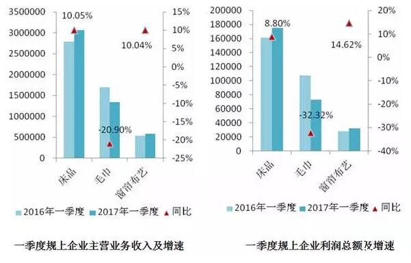 2017年一季度,国家统计局统计的1866户规模以上企业完成主营业务收入609.72亿元,同比增长0.46%;利润总额35.09亿元,同比下降6%。一季度行业规模以上企业运营增速和效益双双下滑,其主要原因是规模以上毛巾企业主要运行指标大幅下滑造成的。除280家规模以上毛巾企业外,其他1586家规模以上家纺企业一季度主营业务收入同比增长8.78%,利润总额同比增长5.58%。