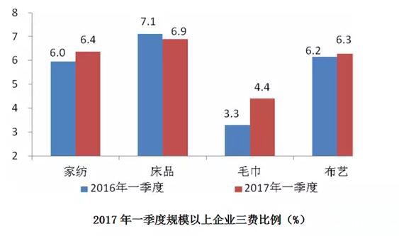 2017年一季度,规模以上家纺企业主营业务收入同比增长0.46%,主营业务成本占主营业务收入的比重稳定在87.6%。但规上企业的三项费用占比确提高了0.4个百分点,达到了6.4%。三项费用占比提高的主要原因是销售费用增长过快,费用增长过快挤压了企业的盈利空间。