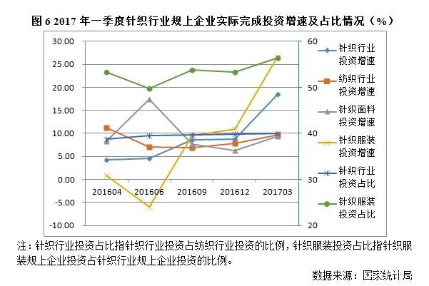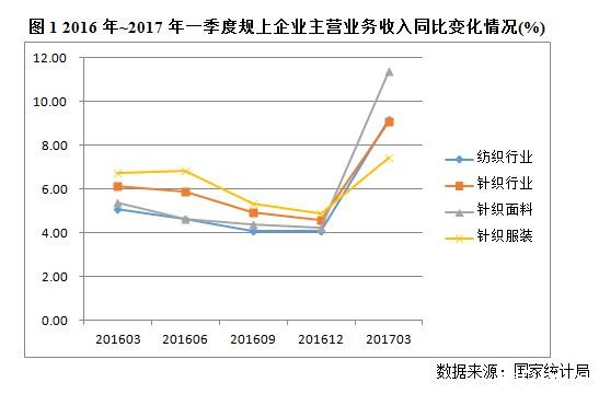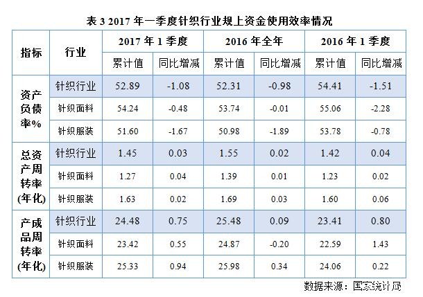2017年一季度,针织行业规上企业运行态势良好,企业产销流动性提高;内销增长带动行业市场和产品结构调整;行业盈利状态改善,资金使用状态良好,但成本费用继续提升;同时,行业投资加快,特别是针织服装投资的触底反弹,带动行业投资快速增长。