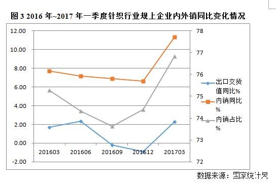 2017年一季度针织行业内销市场领先海外市场回暖,行业投资增速加快,国内经济企稳迹象明显,加之国内消费升级作用进一步显现,内销对行业发展的拉动作用越发重要。一季度海外市场依然没有较大改观,我国对欧美日等国出口持续下行,但针织面料对东盟、孟加拉国、斯里兰卡和巴基斯坦等国家出口明显提速,针织服装产能转移现象明显。