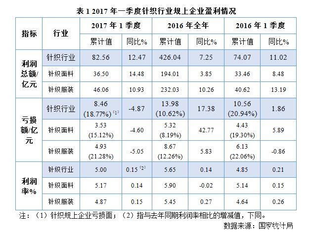 2017年一季度针织行业显示较好的复苏迹象,行业盈利情况明显改善。利润总额同比增长12.47%,较去年一季度提高1.45;行业亏损额有所收窄,亏损企业亏损额同比降低4.87%,较去年一季度降低6.73个百分点,但亏损面较去年全年有所扩大,亏损面为18.77%,较去年同期降低2.17个百分点,但较去年全年扩大了8.15个百分点,行业显示出明显的两极分化现象;行业利润率水平较去年一季度有所提升,但较去年全年有所降低。