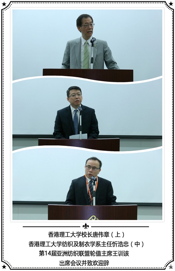 本次会议的主题为“纺织及供应链的颠覆式创新”。香港理工大学校长唐伟章、香港理工大学纺织及制衣学系主任忻浩忠出席会议并代表会议主办方致欢迎辞,第14届亚洲纺织联盟轮值主席王训该代表FAPTA致辞并主持了28日上午的主题大会,29日上午主题会议由中国纺织工程学会常务副理事长伏广伟主持。