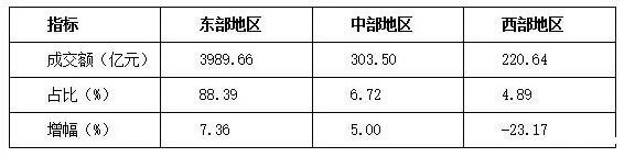 在41家可比样本市场中,东部地区专业市场成交额为3989.66亿元,同比增长7.36%;中部地区专业市场成交额为303.50亿元,同比增长5.00%;西部地区专业市场成交额为220.64亿元,同比下降23.17%。