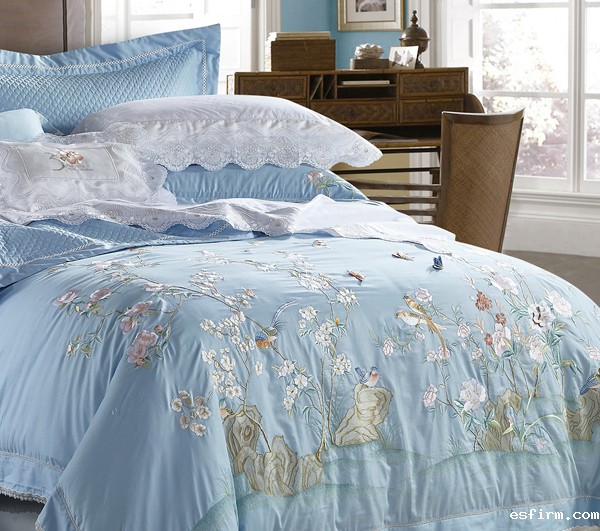 “春华秋实”堂皇绣花床品采用了26种堂皇家纺特有的针法和32种不同色彩的绣花线,立体绣使花瓣绽放的淋漓尽致,剪绒花卉体现了花瓣的质感与厚度,牛筋绣、珠片绣、割边绣增加了套件的肌理和光泽,整体构图凸显大自然的盎然生机和江南刺绣的儒雅神韵。