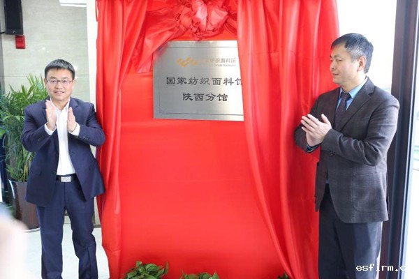 中国纺织工程学会常务副理事长伏广伟(右)和咸阳市人民政府副市长张小平为国家纺织面料馆陕西分馆揭牌