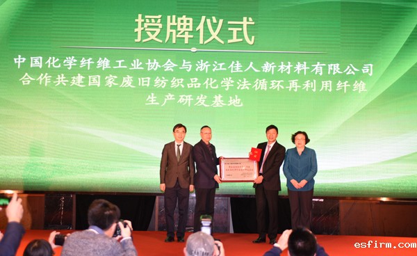 会上还举行了中国化学纤维工业协会、国家纺织化纤产品开发中心与浙江佳人新材料有限公司共建“国家废旧纺织品化学法循环再利用纤维生产研发基地”的授牌仪式,旨在促进企业继续加强与下游应用领域的合作,引领我国废旧纺织品循环再利用纤维行业的研发与应用,在行业中发挥示范作用,为中国化纤行业的可持续发展和产业升级做出应有的贡献。
