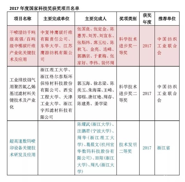 1月8日,2017国家科学技术奖励大会在北京人民大会堂隆重举行。党和国家领导人习近平、李克强、张高丽、王沪宁出席大会并为获奖代表颁奖。2017年纺织行业有3项成果获得国家科技奖的最高荣誉:干喷湿纺千吨级高强/百吨级中模碳纤维产业化关键技术及应用、工业排放烟气用聚四氟乙烯基过滤材料关键技术及产业化、超高速数码喷印设备关键技术研发及应用项目分别获国家科学技术进步一等奖、二等奖和国家技术发明二等奖。