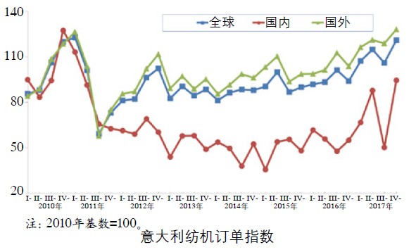 日前, 意大利纺机制造商协会(ACIMIT)发表了2017年10 — 12月纺机订单指数。据悉,该指数比上年同期增长了29%,为120.9(按2010年=100计)。这一增长既影响海外市场,也影响意大利市场。其中,海外市场指数绝对值达128点(+23%)。国内市场指数与2016年同期相比,增幅达72%,绝对值达94.5点。