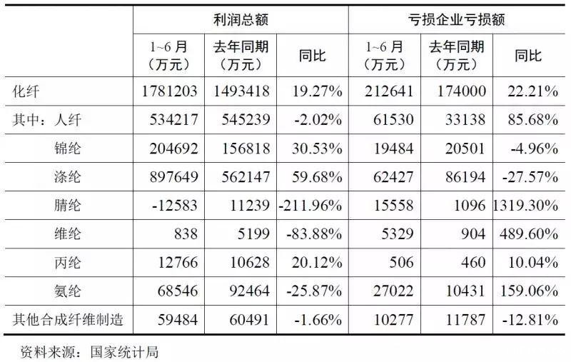上半年,化纤行业主营业务收入和利润总额同比增速逐渐提高,从5月份起,利润总额由负增长扭转为正增长。国家统计局数据显示:1~6月,化纤行业主营业务收入3873亿元,同比增长16.27%;实现利润总额178亿元,同比增加19.27%。行业亏损面21.92%,同比增加了4.66个百分点,亏损企业亏损额同比也增加了22.21%。行业利润总额和亏损企业亏损额都在增加,说明企业盈利能力更加分化。