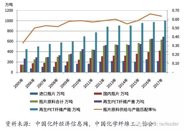 2005—2017年中国再生涤纶行业原料供应与产能匹配情况
