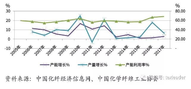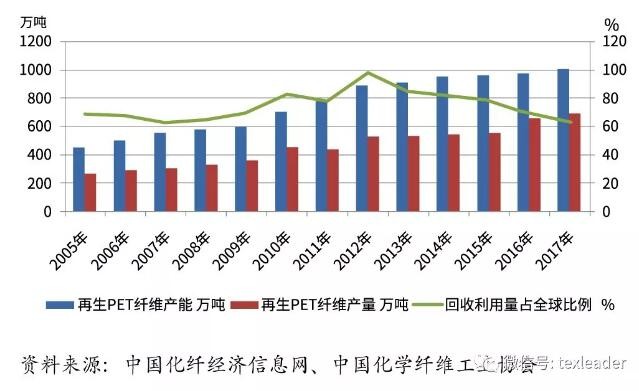 2005—2017年再生PET纤维产能、产量和利用率增长变化