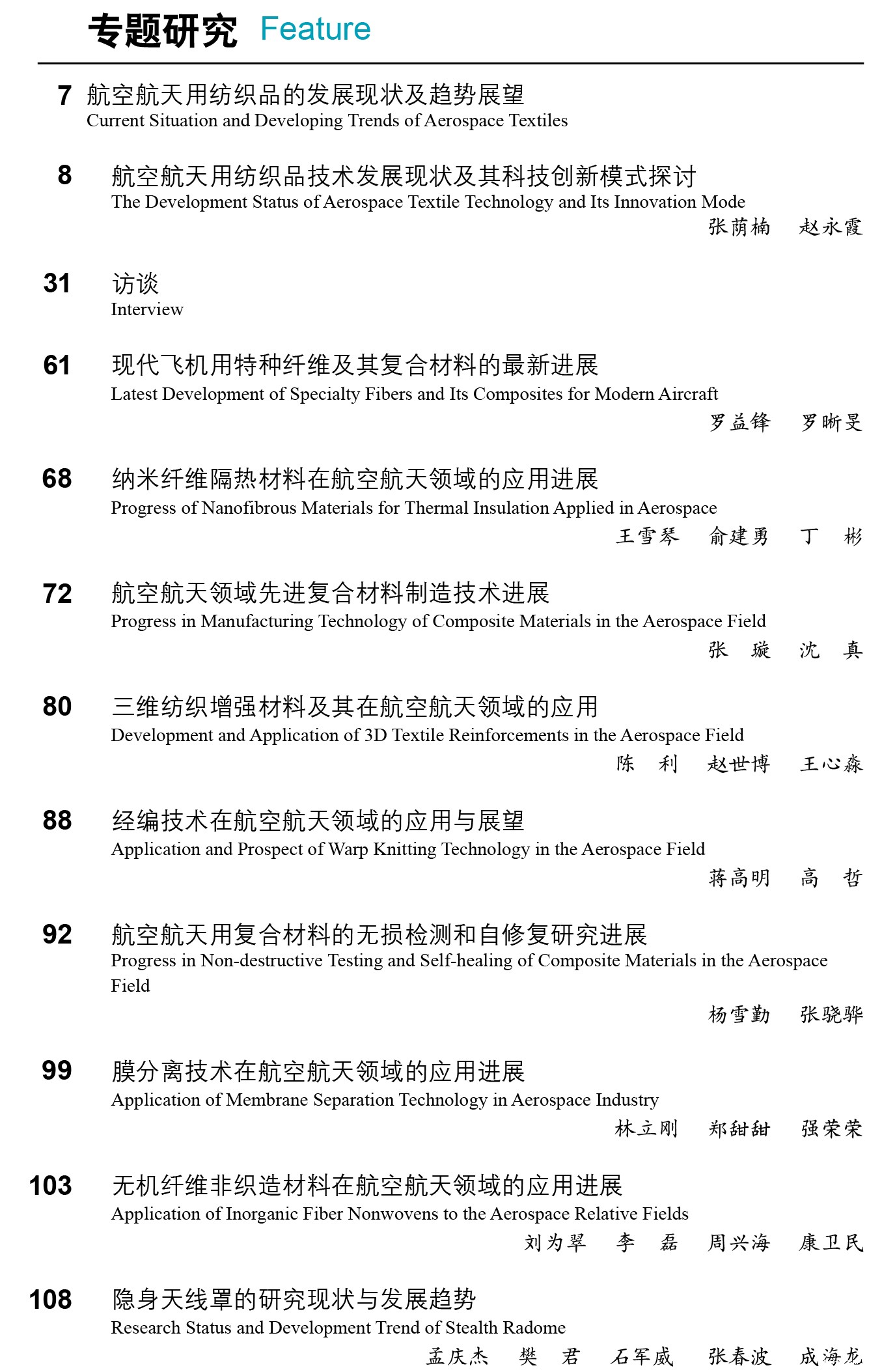 为了盘点航空航天用纺织品的前沿技术进展,本刊从纤维原料、结构增强材料、无机纤维非织造材料、复合材料加工技术、复合材料无损检测和自修复、膜分离技术、隐身天线罩等主要的技术点切入,邀请相关领域专家就各领域的前沿技术进行了综述,真知灼见,与行业共享!