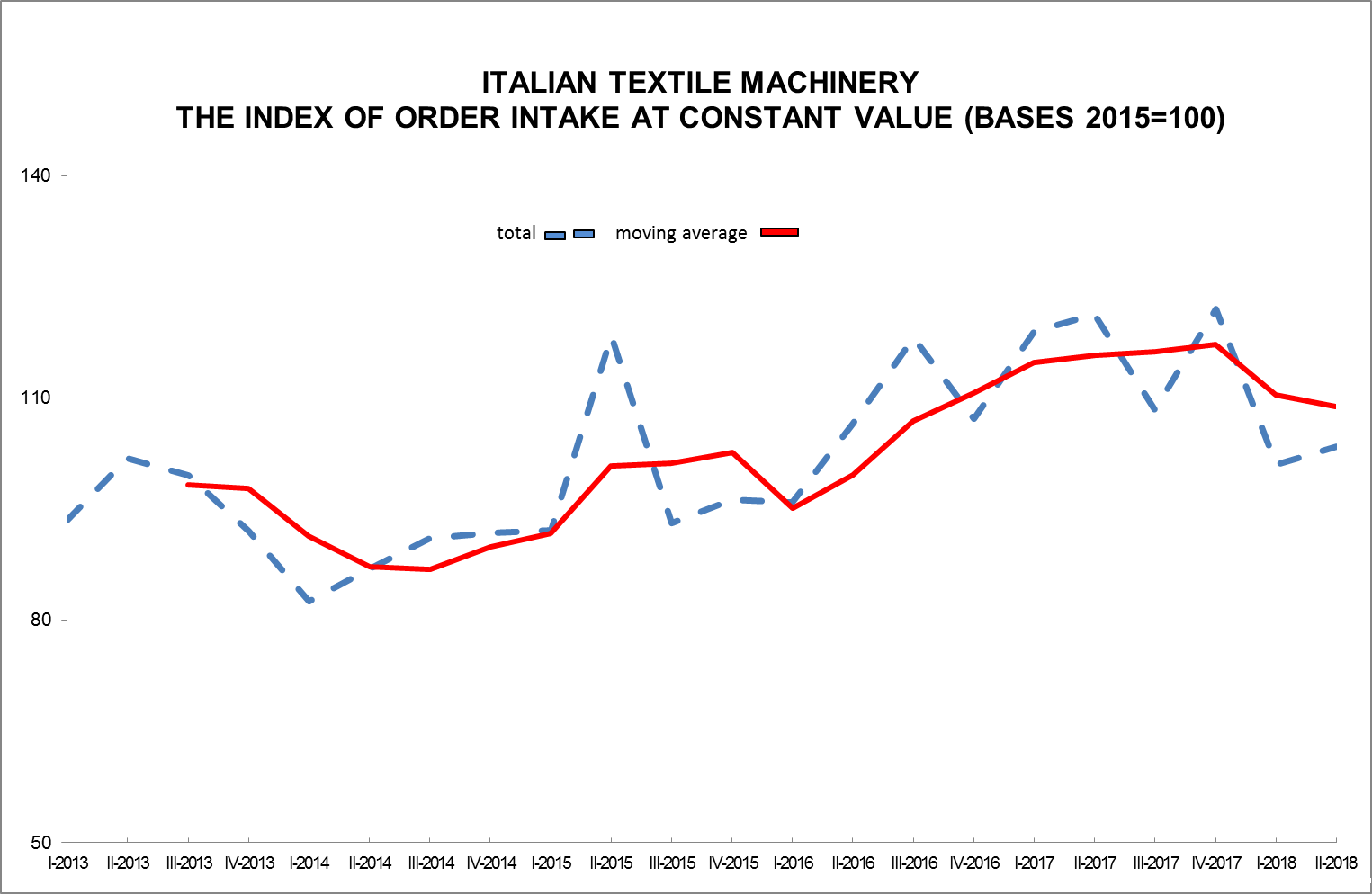 日前,意大利纺机制造商协会(ACIMIT)发表了2018年 4 — 6 月纺机订单指数。据悉,该指数比上年同期下降了15%,为103.4 (按2015年=100计)。这一下降既影响海外市场,也影响意大利市场。其中,国内市场指数与2017年同期相比,下降了13%,绝对值达141.4点。对海外市场而言,市场指数绝对值为99.6点,同比下降14%。
