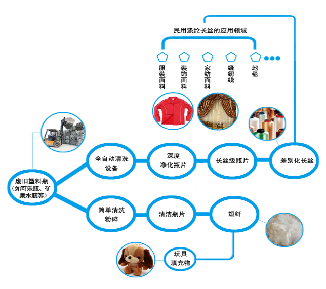 在我国再生PET纤维的适用性市场上,再生PET纤维以其高性价比对原生PET对应规格的产品已经实现了全方位替代。在这些细分市场上,原生PET纤维的物理、化学和机械性能与再生PET纤维相同,只是原生纤维色泽更好,而这些细分市场上的产品对色泽并没有特别要求。