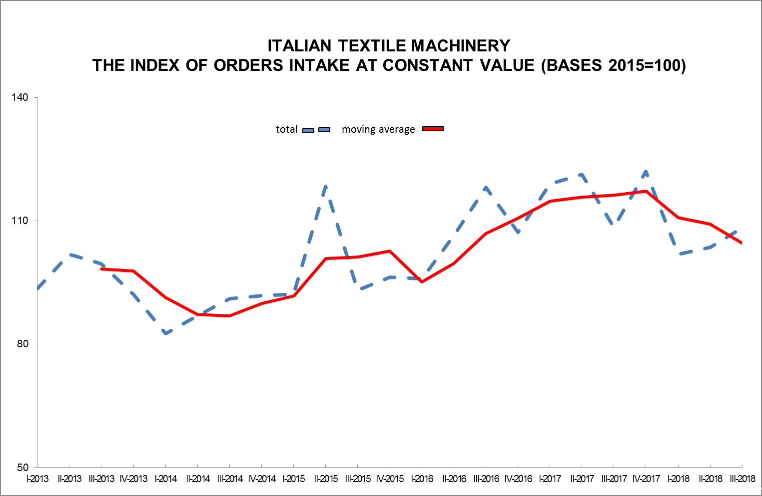 日前,意大利纺织机械制造商协会(ACIMIT)发表了2018年 1 — 9 月纺机订单指数。据悉,该指数与上年同期相比变化不大,为108.3 (按2015年=100计)。相比之下,意大利纺机订单数量则显示出截然不同的趋势,市场指数绝对值为121.9个基点,与2017年 7 — 9 月相比增长了30%;就国外市场而言,该指数则下跌了2%, 绝对值为107.4。
