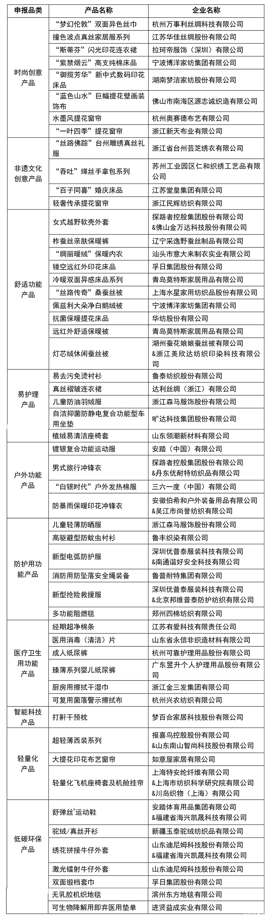 培育和推广2018年度十大类纺织创新产品获选产品及单位名单