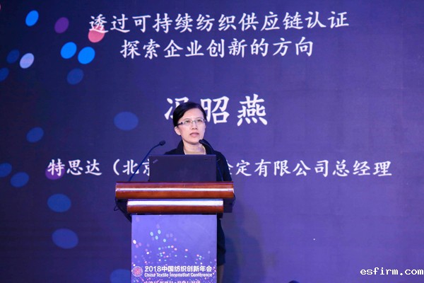 特思达(北京)纺织检定有限公司总经理冯昭燕发表了题为“透过可持续纺织供应链认证,探索企业创新的方向”的演讲。据她介绍,全球特别是中国消费者对环境气候和可持续概念颇为关注,从而更加注重纺织品有害物质的输出。纺织企业在绿色、时尚、科技领域的突破与创新、高效质量管理的保证,与其供应链建设水平的高低密切相关。特思达借助于可持续纺织供应链的认证数据,全方位、多角度地分析了国内外市场上品牌商与零售商的最新动向、消费者的最新需求,企业在全球超过60个国家和地区有办事机构,该项目尝试从纺织生产输入管理入手,解决生产过程管理从而达到实现在输出管理上提供可持续的生态安全的产品,去建立一个可持续的纺织生态链。从而能够让消费者和企业通过负责任的决定来保护地球。