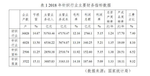 2018年针织行业经济运行质效总体优于纺织行业。据国家统计局统计,2018年1-12月针织行业主营收入增速基本维持稳定,并高于纺织行业主营收入增速,全年增速为5.38%;行业利润总额完成340.25亿元,利润总额增速前三季度持续提升,第四季度增速出现回落,全年同比增长为5.99%,较2017年提高1个百分点。其中,针织面料类2506家规上企业利润总额完成152.60 亿元,同比增长9.84%;针织服装类3522家规上企业利润总额完成187.66亿元,同比增长3.05%。从具体财务指标数据看,2018年,针织行业利润率5.21%,较纺织行业高0.06个百分点,较2017年降低了0.38个百分点,其中针织面料类规上企业利润率为5.35%,针织服装类规上企业利润率为5.09%;针织行业总资产周转率和产成品周转率分别为1.35次/年和19.09次/年,均高于纺织行业平均水平;针织行业三费占比为8.10%,其中针织服装9.32%,针织面料6.52%;行业亏损面为13.50%,较2017年的11.28%提高了2.22个百分点。