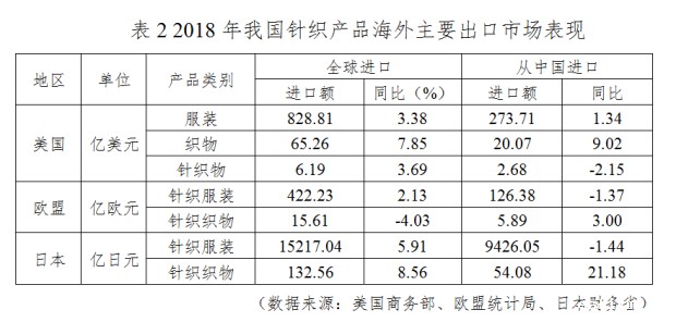 从分市场数据看,2018年我国在美国、欧盟、日本等传统出口市场表现不一。美国市场方面,据美国商务部统计,2018年美国从全球进口服装828.81亿美元,同比增长3.38%,从中国进口273.71亿美元,同比增长1.34%;织物进口65.26亿美元,同比增长7.85%,从中国进口20.07亿美元,同比增长9.02%,其中针织织物进口6.19亿美元,同比增长3.69%,从中国进口2.68亿美元,同比增长-2.15%。欧盟市场方面,据欧盟统计局统计,2018年欧盟28国进口针织服装及附件422.23亿欧元,同比增长2.13%,从中国进口126.38亿欧元,同比-1.37%;进口针织织物15.61亿欧元,同比增长-4.03%,从中国进口5.89亿欧元,同比增长3.0%。日本市场方面,据日本外务省统计,2018年日本进口针织服装及附件15217.04亿日元,同比增长5.91%,从中国进口9426.05亿日元,同比-1.44%;进口针织织物132.56亿日元,同比增长8.56%,从中国进口54.08亿日元,同比增长21.18%。
