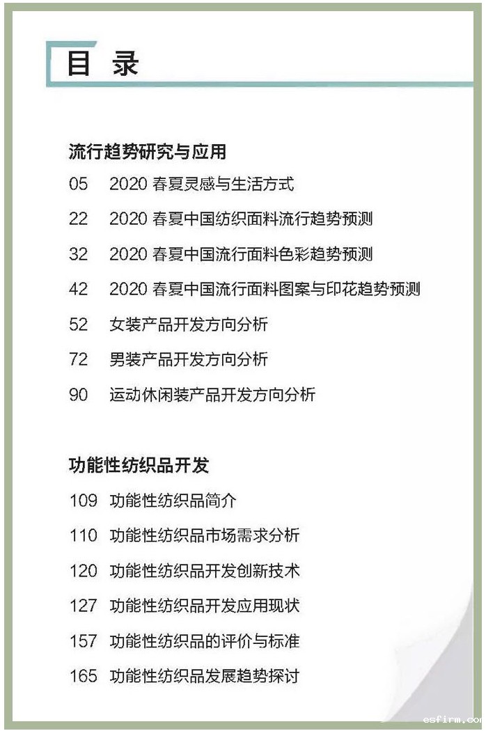 在详细解析2020春夏灵感与生活方式、中国纺织面料流行趋势(包括色彩、图案、印花、面料风格)的基础上,结合纺织面料开发技术要素,分别阐述了女装、男装、运动休闲装等终端成衣未来季节的开发方向和终端应用建议。