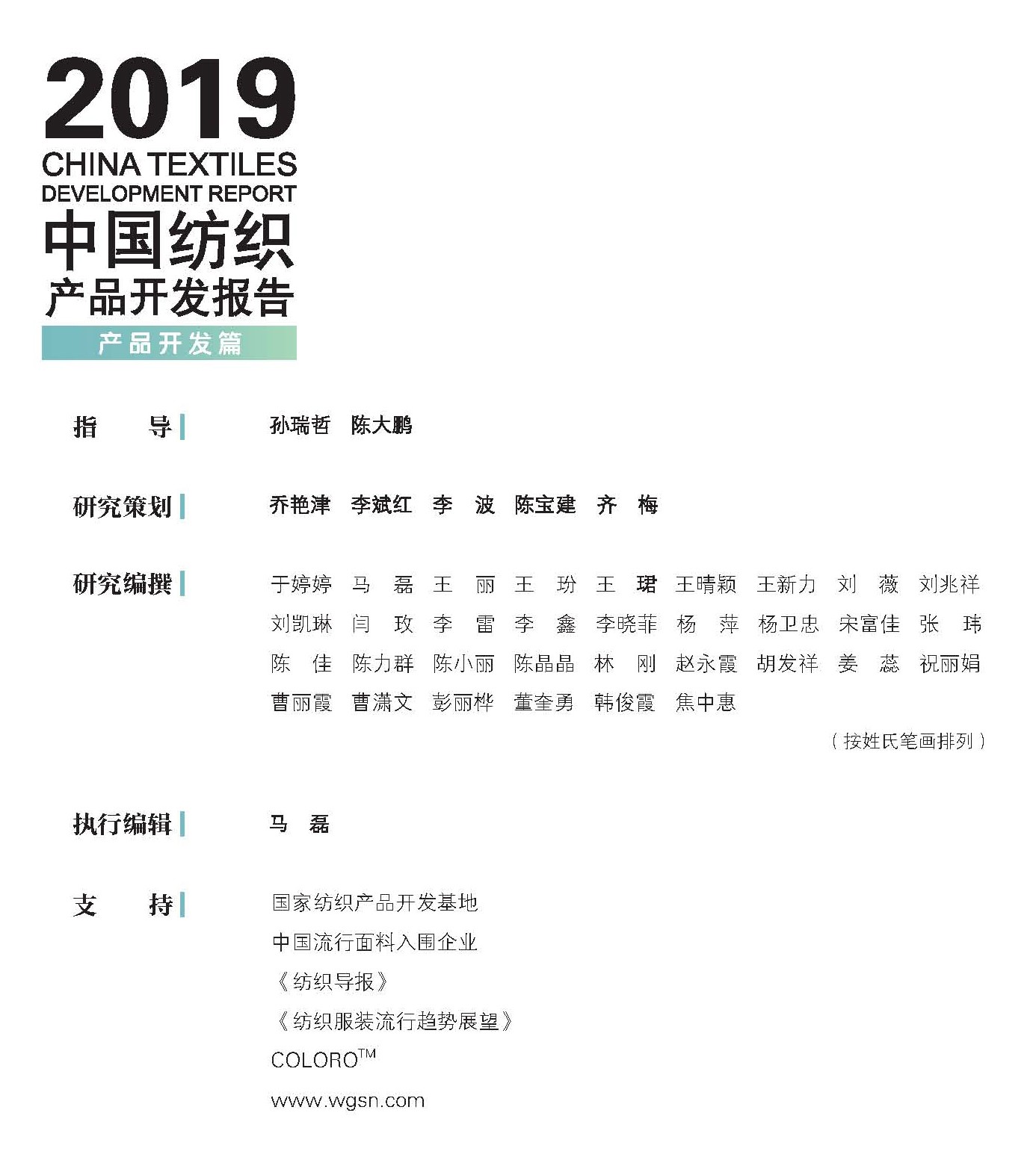 《2019中国纺织产品开发报告—产品开发篇》全书共172页,内容包含流行趋势研究与应用、功能性纺织品开发两大篇章,融合市场需求、科技进步与流行趋势,力求为从事纺织产品开发和技术管理工作的人员提供更多的产品开发理念和实际指导。