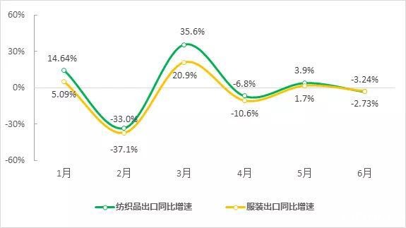 今年6月,全国纺织品当月出口103.1亿美元,同比下降3.24%(以人民币计同比增长3.85%);服装当月出口143.4亿美元,同比下降2.73%(以人民币计同比增长4.51%)。