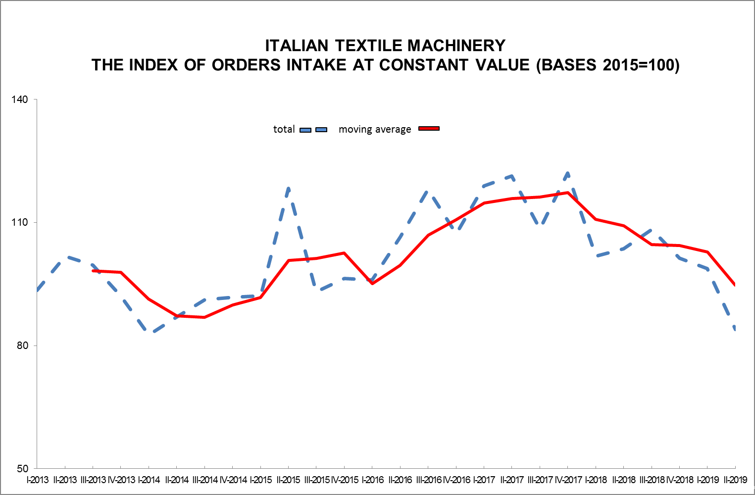 日前,意大利纺机制造商协会(ACIMIT)发表了2019年 4 — 6 月纺机订单指数。据悉,该指数比上年同期下降了19%。订单指数为84个点(基数2015年= 100)。