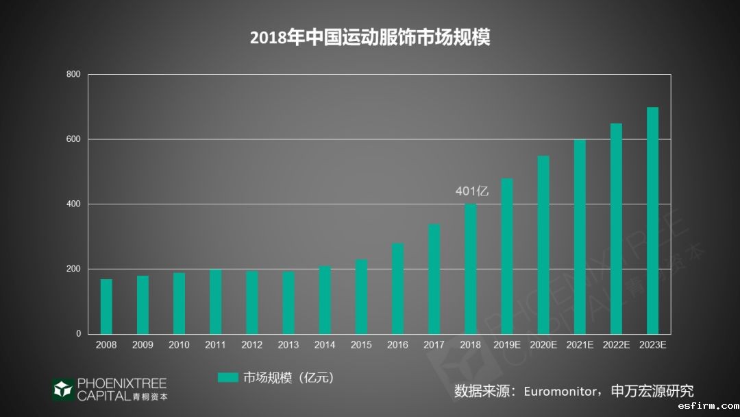 中国运动服装市场快速成长,增速遥遥领先。2018年中国运动服装市场超400亿美元,同比增长近20%,增速自2014年来不断加快;服装消费结构发生改变,2018年运动服装占整体服装消费比重攀升至12.8%,而在2013年仅8.8%。
