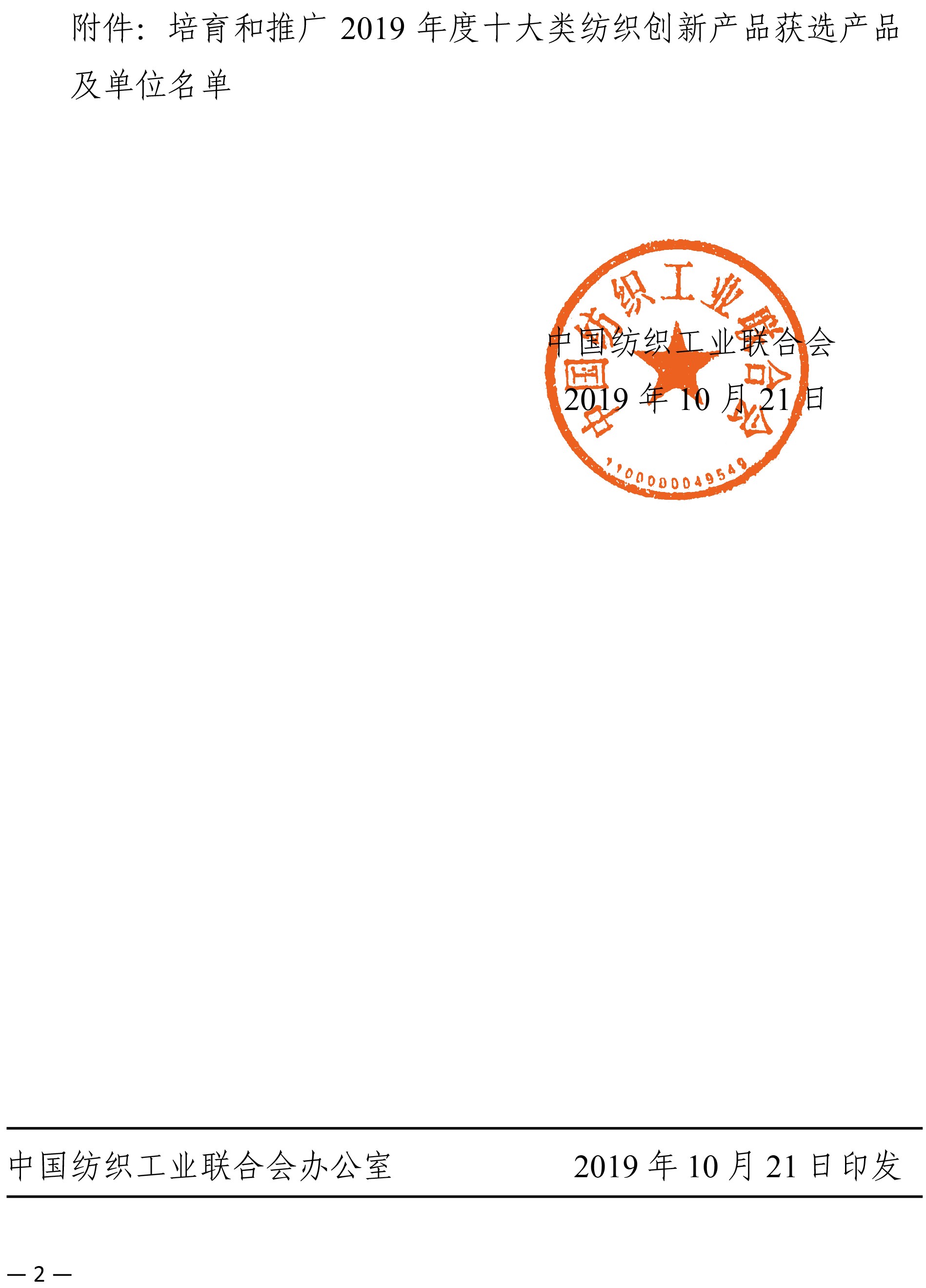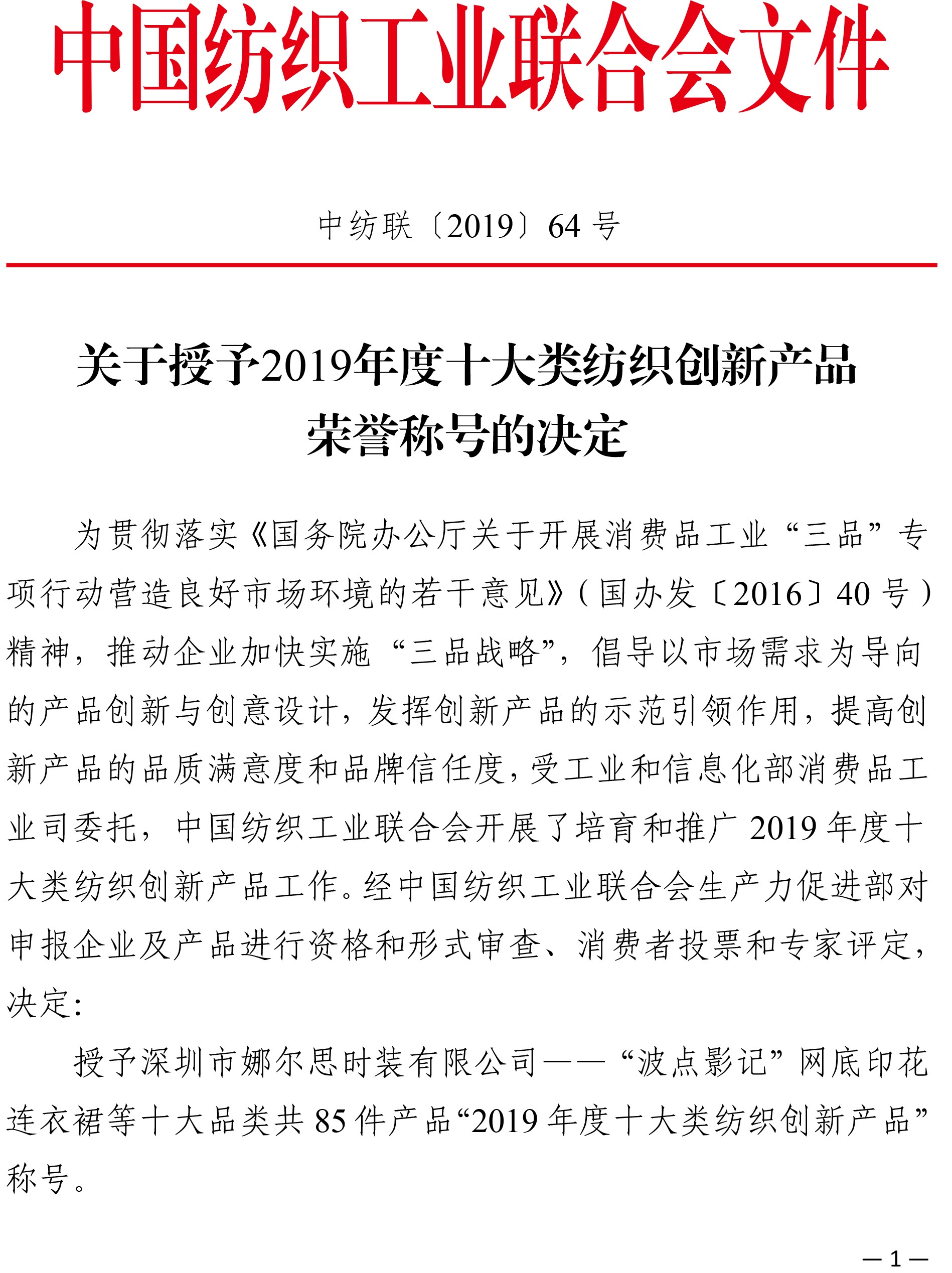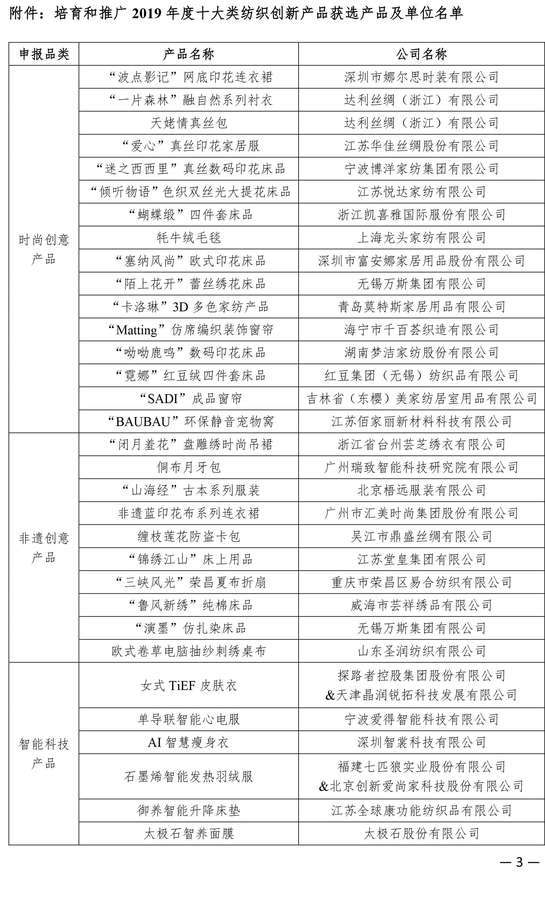 为贯彻落实《国务院办公厅关于开展消费品工业“三品”专项行动营造良好市场环境的若干意见》(国办发〔2016〕40号)精神,推动企业加快实施“三品战略”,倡导以市场需求为导向的产品创新与创意设计,发挥创新产品的示范引领作用,提高创新产品的品质满意度和品牌信任度,受工业和信息化部消费品工业司委托,伟德app官方正版下载地址开展了培育和推广2019年度十大类纺织创新产品工作。经伟德app官方正版下载地址生产力促进部对申报企业及产品进行资格和形式审查、消费者投票和专家评定,决定: