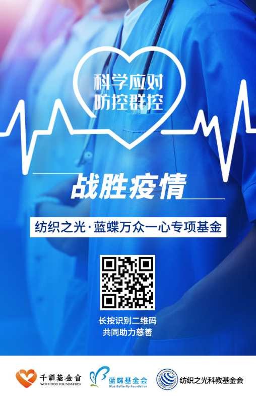 2月3日,由纺织之光科技教育基金会发起,联合北京蓝蝶基金会和浙江千训基金会成立“蓝蝶万众一心专项基金”,基金所筹款项将用于为湖北黄冈、孝感、荆州,浙江,广东三省医院提供医疗物资、物资运输保障、公共卫生防疫事业建设。