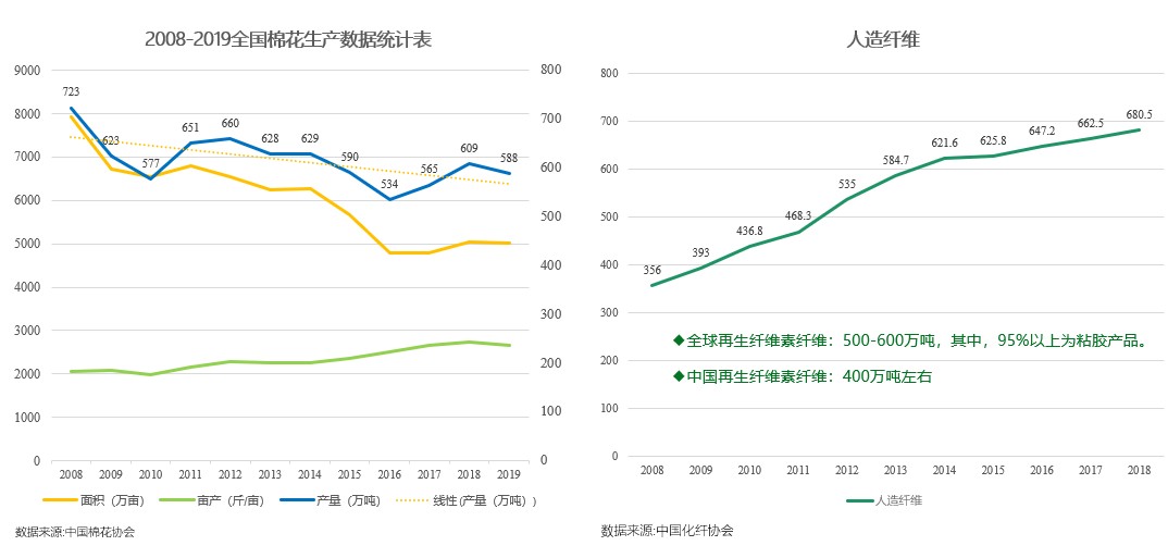 从图中可以看出,从2008年以来,棉花产量在波动中呈下降趋势,而人造纤维产量不断增加,基于两者在规模上和纤维性能上的相似性,可以大胆推测人造纤维填补了棉花产量下降造成的缺口,且这一趋势在未来几年仍将持续。
