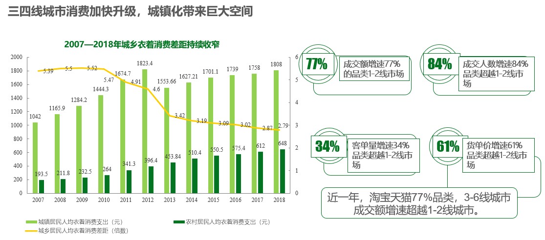城乡居民在衣着上的支出差额逐渐收窄,以小镇青年为代表的、崇尚品质生活的消费群体正在崛起,同时,人口数量的庞大基数意味着未来的下沉市场有很大市场空间等待挖掘。