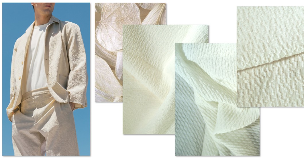 采用强捻纱织造凹凸不平的织物结构,形成干爽的触感和立体的外观效果。
