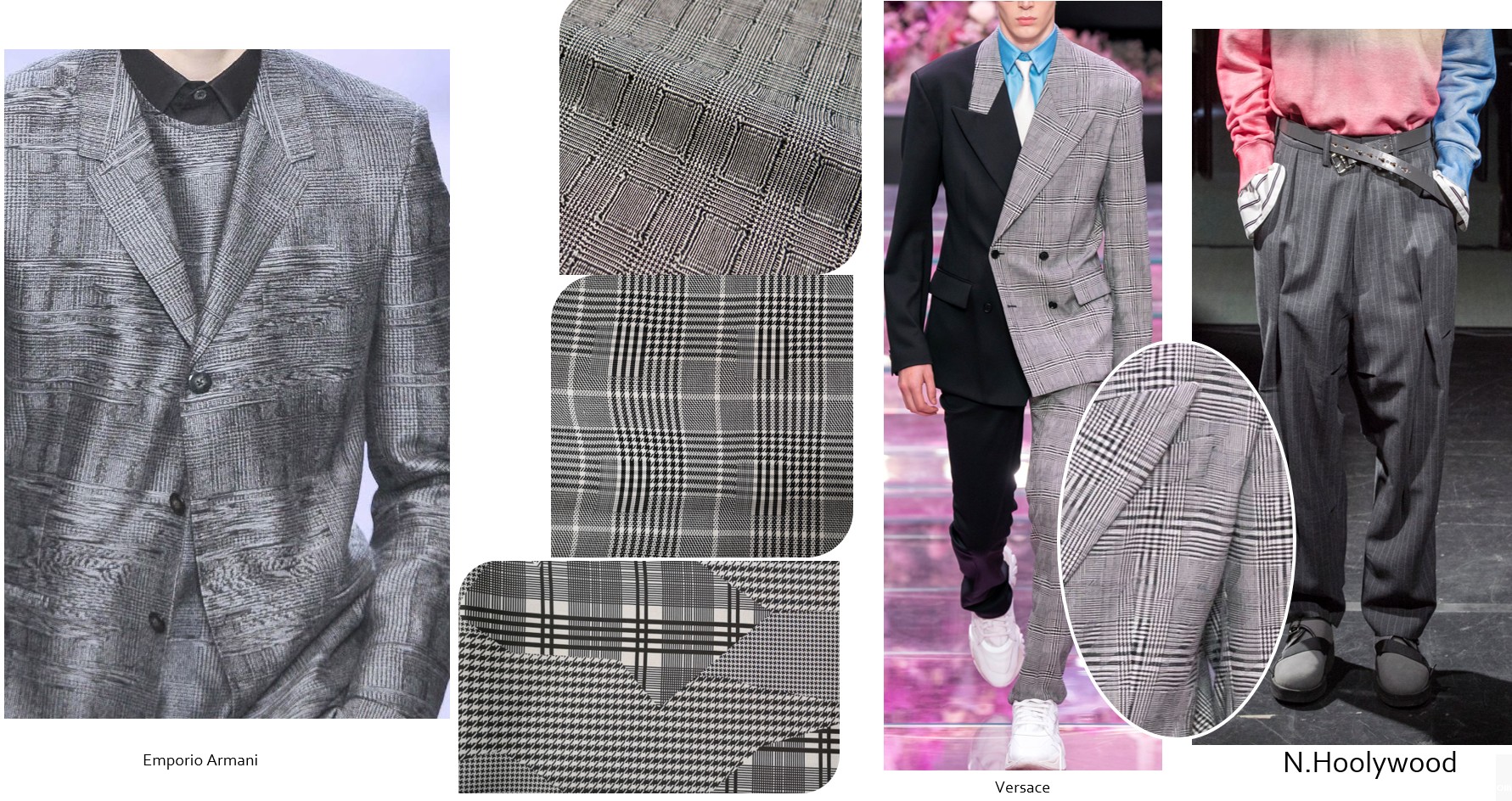 原液着色涤纶与优可丝®BV纤维交织,不同格纹通过组织结构变化设计呈现出拼接效果,还可以结合剪线工艺,使拼接效果更为立体、逼真。