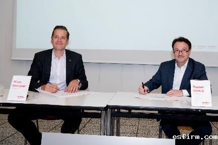 Kloepfel Group 首席执行官Marc Kloepfel 和欧瑞康非织造业务单元董事总经理Rainer Straub(右)签署购买欧瑞康非织造业务单元新型熔喷工艺设备的合同。