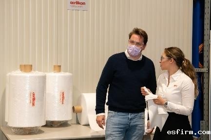 Lindenpartner 首席执行官Philipp Heymann 听取欧瑞康专家Juliane Müller-Weigel 关于欧瑞康非织造业务单元熔喷工艺设备优势的介绍。