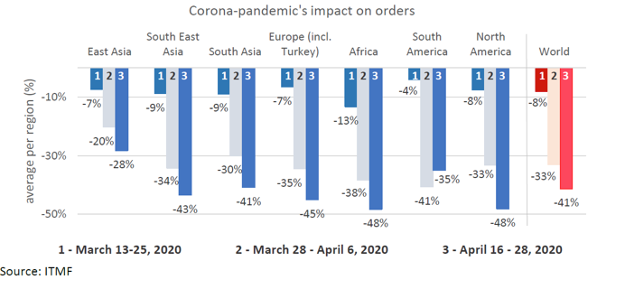 值得注意的是,东亚地区的订单降幅为28%,明显低于其他所有地区(41%及以上)。可以假设,这个地区首先受到新冠疫情带来的影响,也首先从危机中恢复。特别是中国和韩国成功地控制了疫情,在过去的几周里,大多数中国纺织企业都大幅提高了产量。同时,线下零售店也重新开张,东亚国家的消费开始逐步恢复。但是消费情况将如何变化,还有待进一步观望。