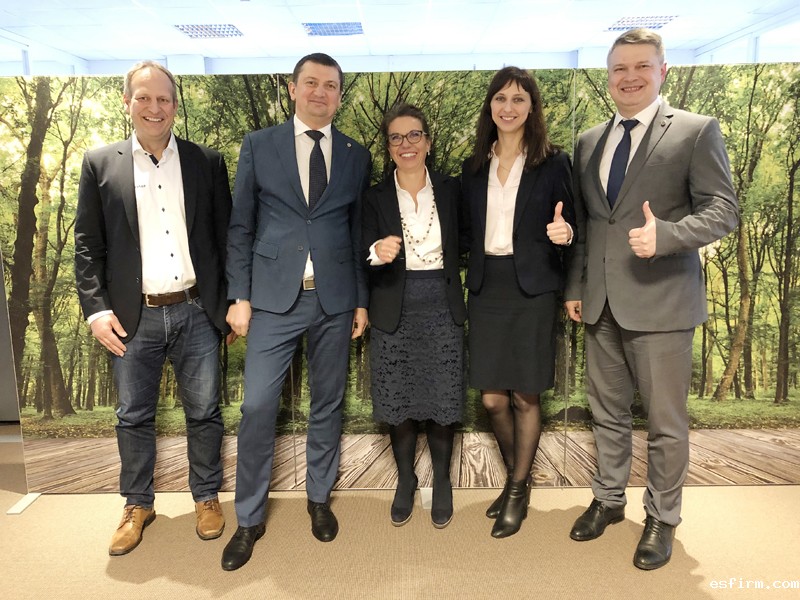 布鲁克纳公司销售Mathias Strecker(左一),Steklovolokno公司总经理Oleg Kurilin(左二),布鲁克纳公司 CEO Regina Brückner(中),Steklovolokno公司项目经理Hanna Padalitsa,Steklovolokno公司商业总监Yury Kasianov(右一)
