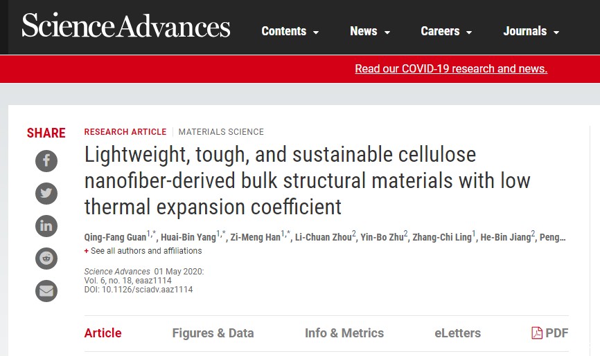 这项研究成果于5月1日以“Lightweight, tough, and sustainable cellulose nanofiber-derived bulk structural materials with low thermal expansion coefficient”为题发表在《科学进展》(Science Advances)杂志上(Science Advances 2020, 6, eaaz1114)。