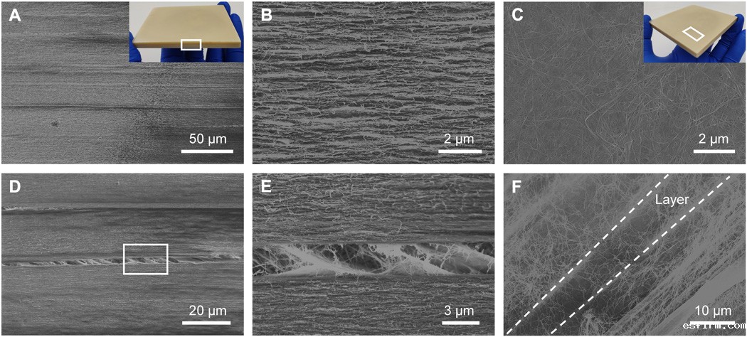 研究发现,CNFP的轻质高强韧特性主要来自材料微米级层状结构和纳米三维网络结构设计。纤维素纳米纤维内部高度结晶可以提供极高的强度,纤维之间通过大量氢键等可逆相互作用网络进行结合,在外力作用下这种高密度的可逆相互作用网络可以迅速解离和重构,吸收大量能量,使材料在具有高强度的同时实现高韧性,克服了传统结构材料难以兼具高强度与高韧性的问题。