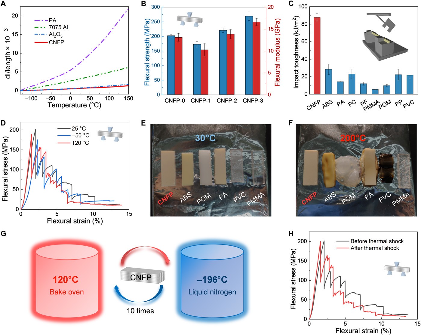 由此可见,这种可持续新型天然纳米纤维仿生结构材料,集成了包括轻质高强韧、高尺寸稳定性、抗热震、抗冲击、高损伤容限等各项优异性能,预计它在轻量化抗冲击防护及缓冲材料、空间材料、精密仪器结构件等领域将拥有广阔的应用前景。