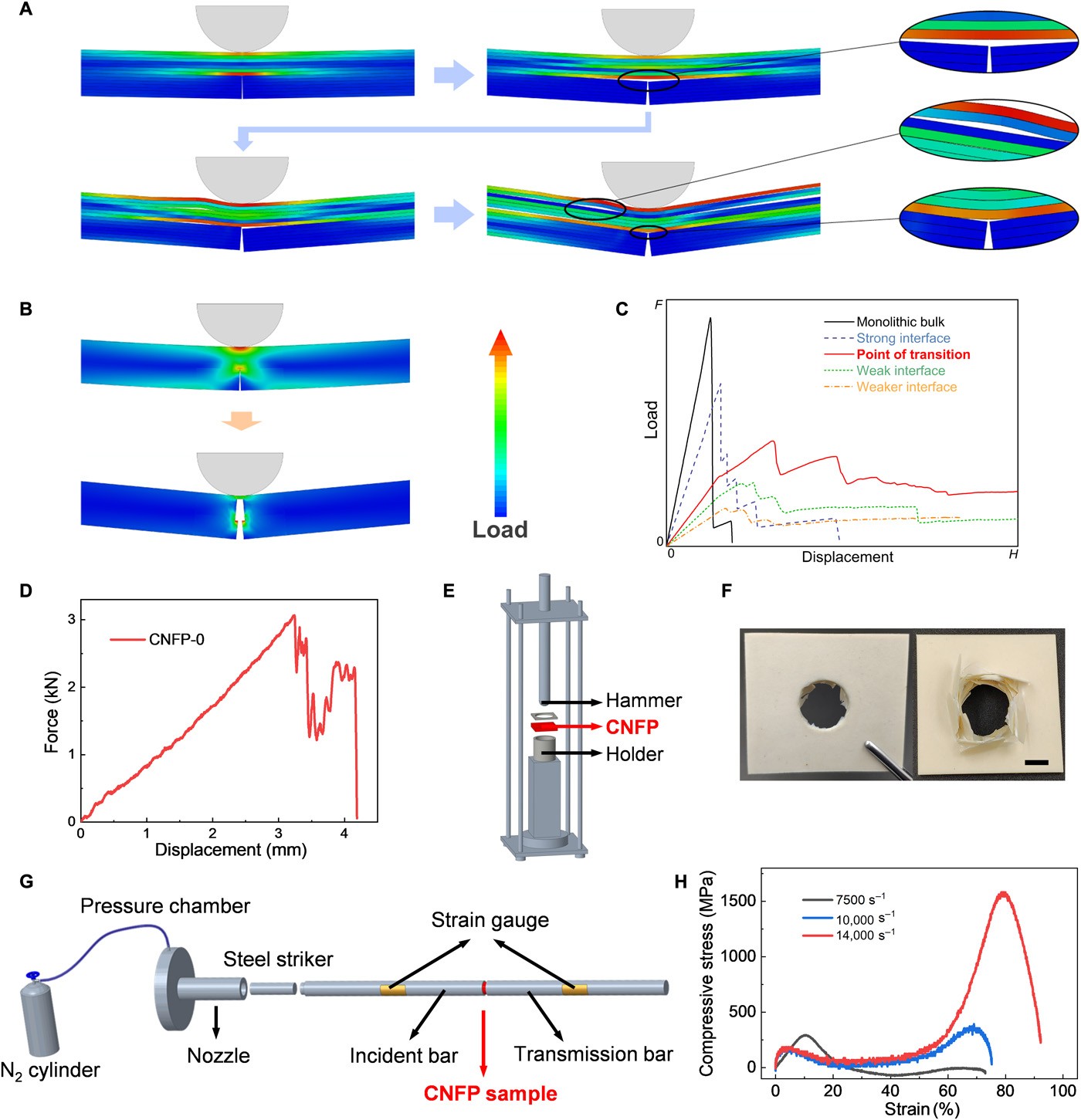 同时,CNFP还具有极高的抗冲击性能、高损伤容限以及高能量吸收性能,有望使其可以作为合金的替代品。分离式霍普金森压杆的超高速冲击实验结果表明,它在28 m · s-1的高速冲击下(速度相当于一辆高速行驶的汽车),表现出1600MPa的超高抗压强度,在0.07 ms内就可吸收高达387.5 MJ · m-3的冲击能量。这主要是由于它内在的三维纳米纤维网络在受到高速冲击时发生滑移,纳米纤维间的大量氢键发生迅速的解离和重构,可将冲击动能吸收并转化为热量。